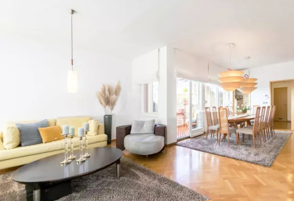 Prodaje se predivan dvoetažni stan u Centru na četvrtom katu zgrade s liftom i dvije garaže te dva spremišta u blizini Kvaternikovog trga. Stan ima 202 m2, pri čemu je sam prostor stana zatvorene površine 175,40 m2. Stan se nalazi na 4. katu pri čemu se donji prostor sastoji od ulaznog predsoblja, wc-a, kuhinje, dnevnog boravka s uređenom loggiom te spavaćom sobom i kupaonicom. Gornja etaža (potkrovlje) sastoji se od hodnika te tri spavaće sobe s kupaonama. Visina prostora je 2.75m. Lokacija stana je idealna za stanovanje, nalazi se u blizini škole, trgovine, tramvaja, bolnice i dr.
