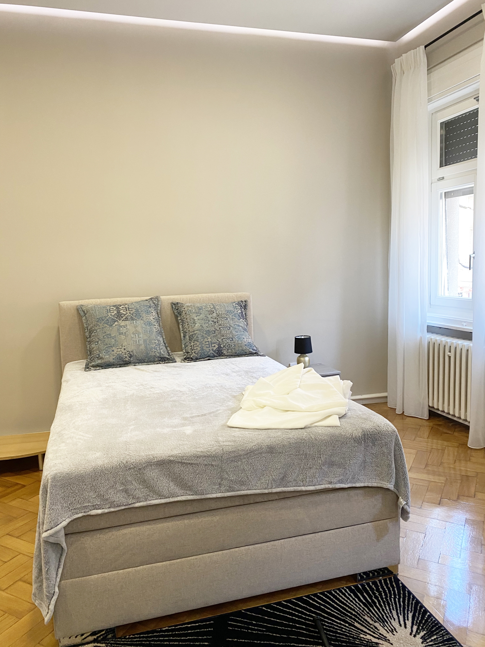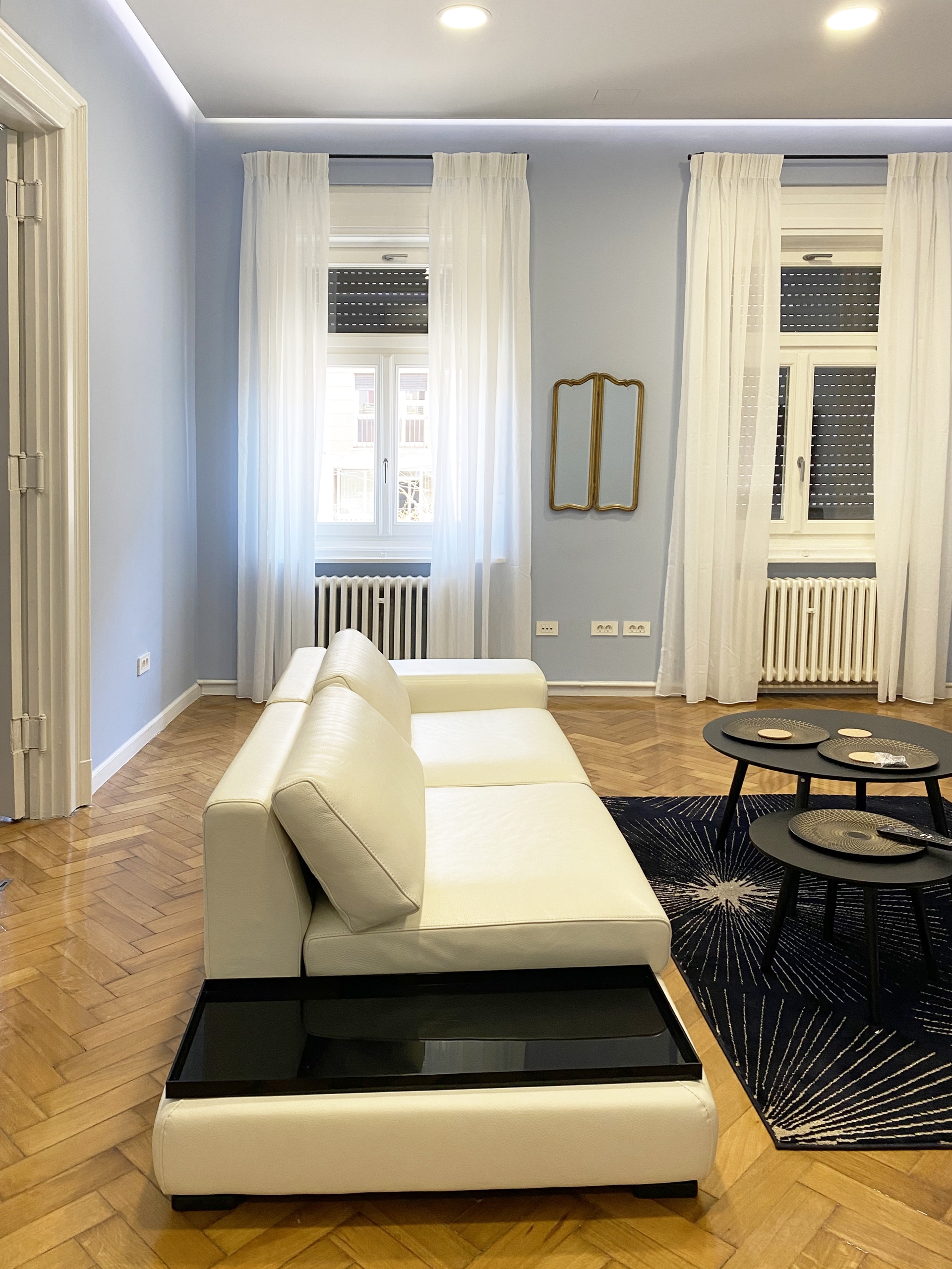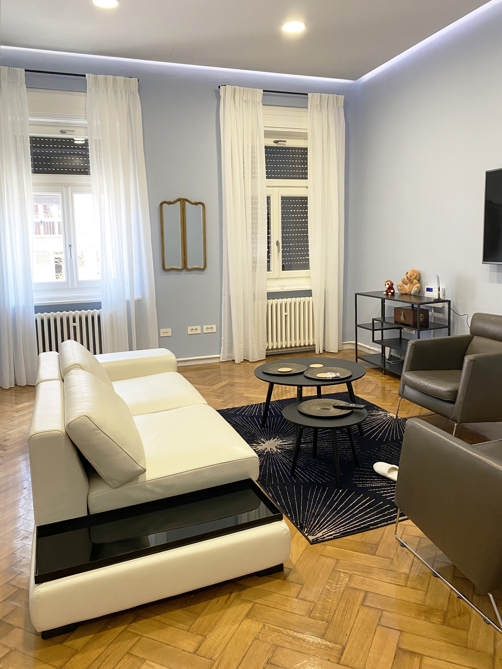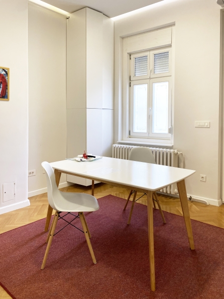Iznajmljuje se predivan moderan namješteni dvosobni stan (80m2) u strogom centru Zagreba – na 1. katu. Stan se sastoji od ulaznog predsoblja, kupaone, kuhinje, blagavaone, dnevnog boravka, spavaće sobe i balkona. Orijentacija stana je istok – zapad. Stanu pripada i  spremište u podrumu. U blizini stana nalazi se tramvajska stanica, mnoštvo dućana, banka, kafića – također glavni gradski trg je svega na 5 min pješke.