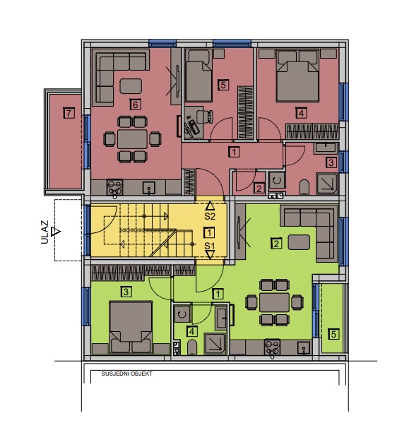 Near the building there are all important facilities for life: school, kindergarten, KBC Dubrava, church, tram, bus, shopping center Supernova.