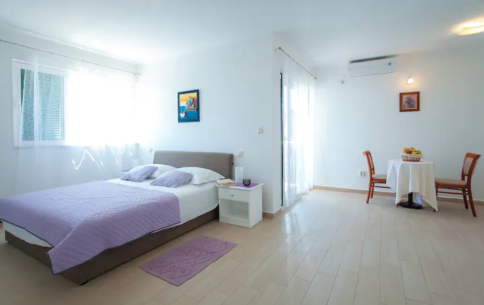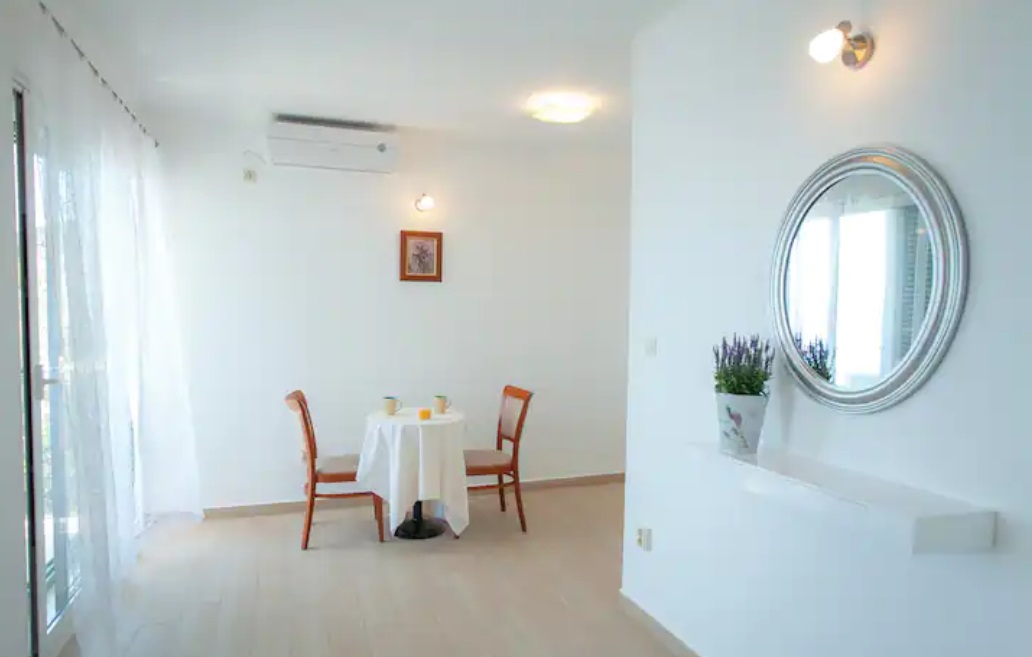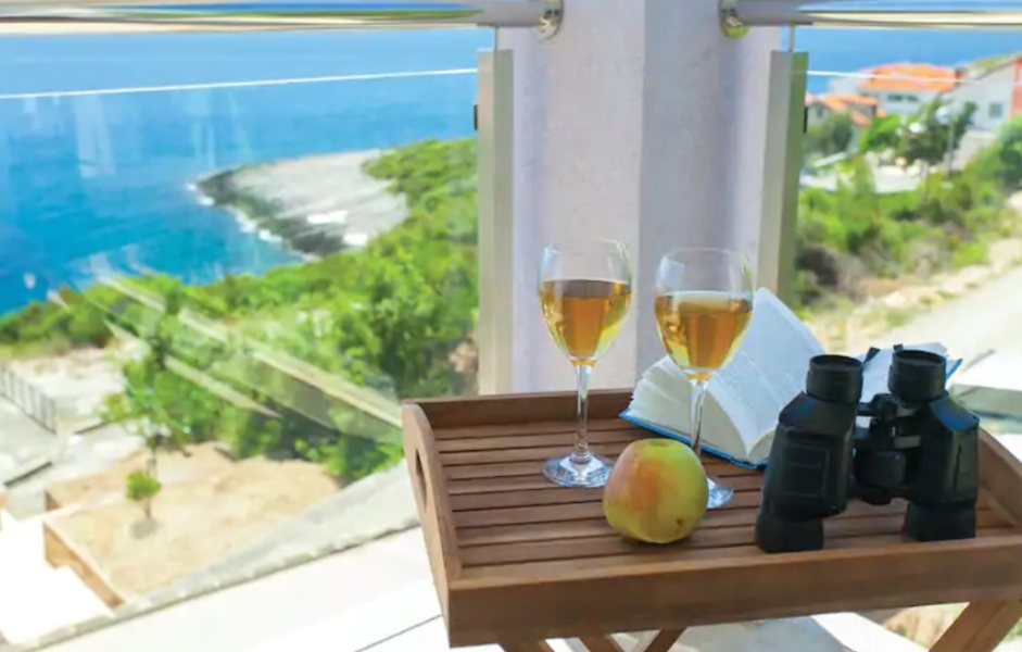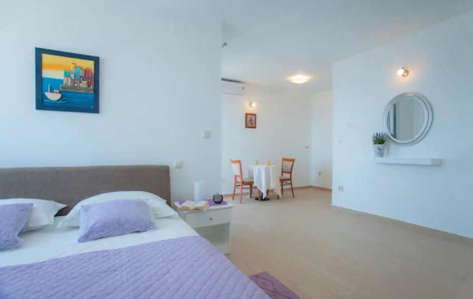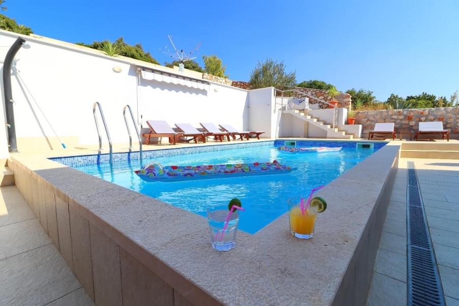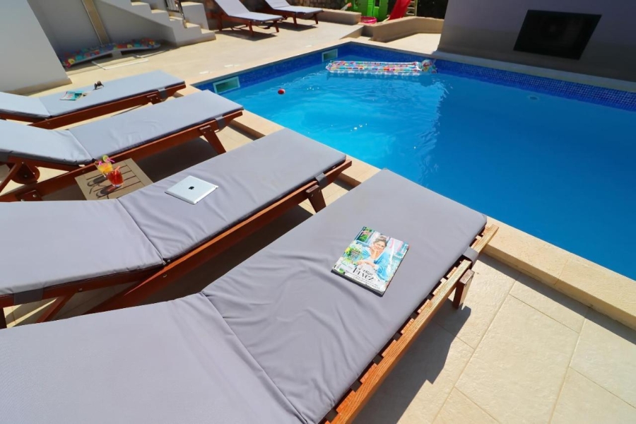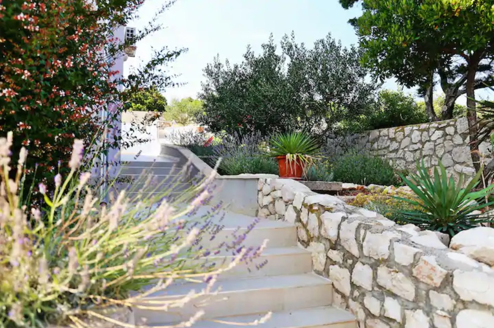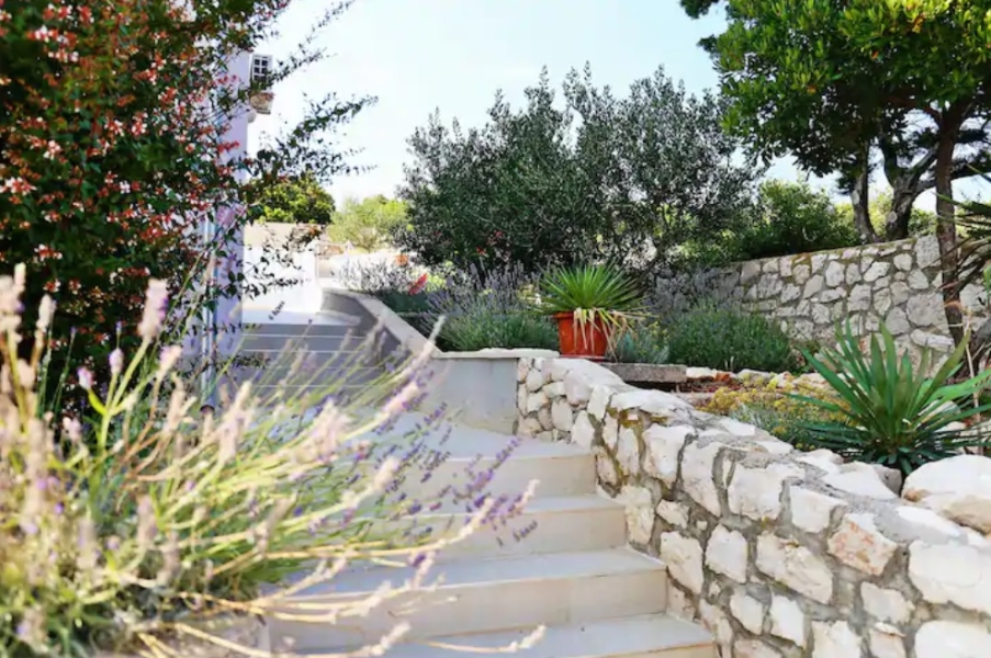 Svaka ima svoju terasu s panoramskim pogledom na more. Jedna natkrivena terasa ima prekrasni pogled na more, a druga terasa nalazi se uz bazen s roštiljem. Na parceli se nalaze i razne kulture maslina, mediteranskog bilja s lavandom, Rosemarie, immortelles..